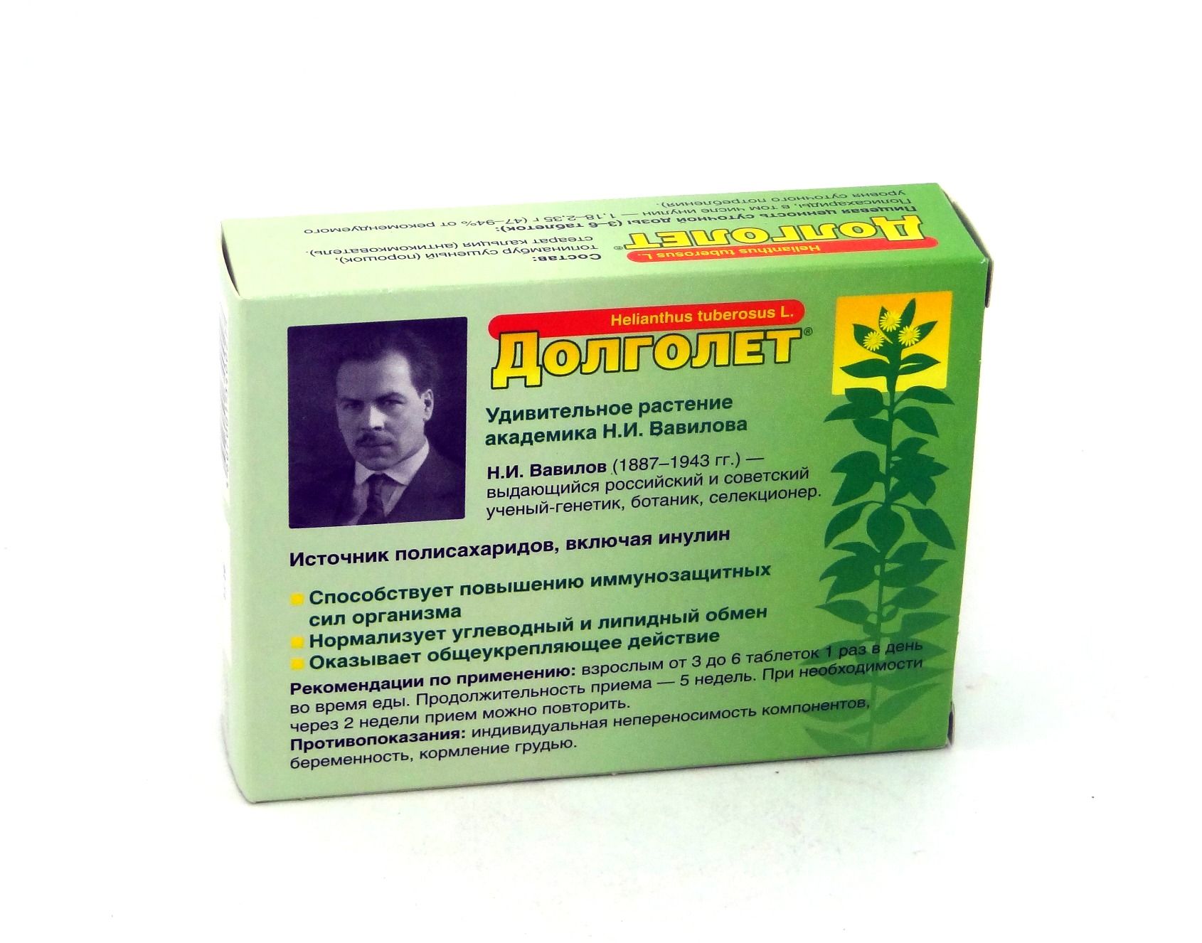 Долголет - биологически активная добавка, дополнительный источник инулина, кремния, магния и калия. Защищает от болезней сердца и сосудов, повышает неспецифическую резистентность организма, нормализует обменные процессы, улучшает состояние волос, ногтей, соединительной и костной тканей, предупреждает развитие сахарного диабета.